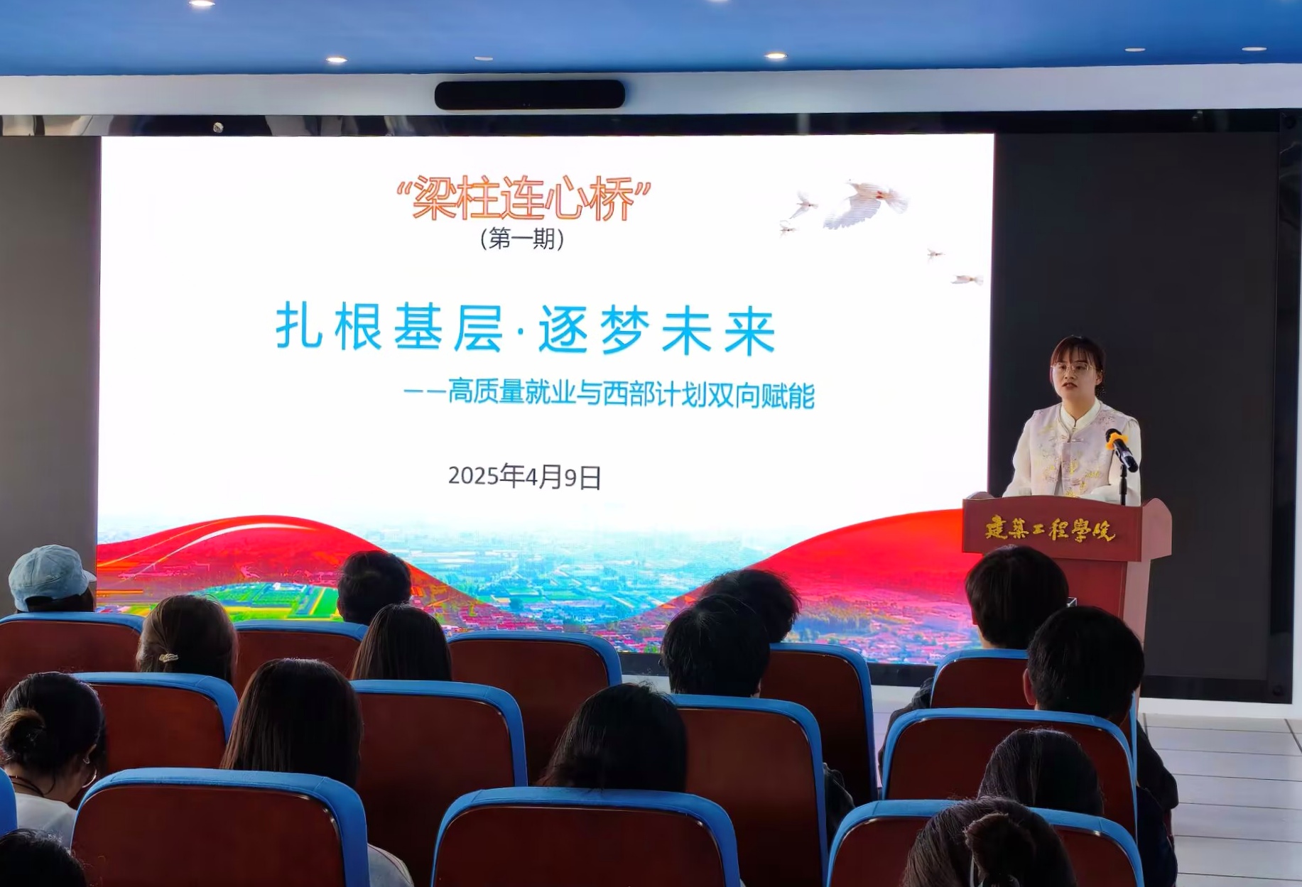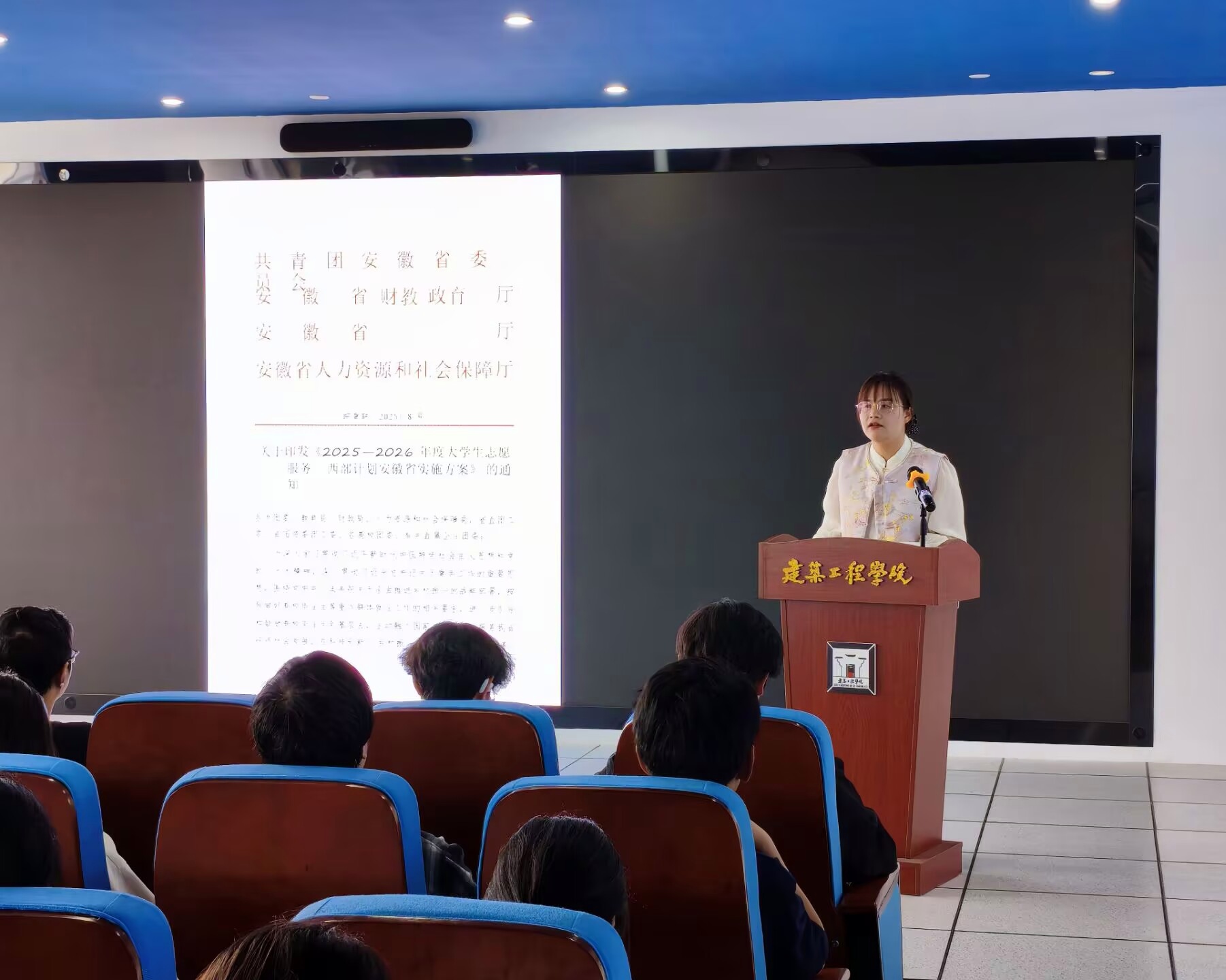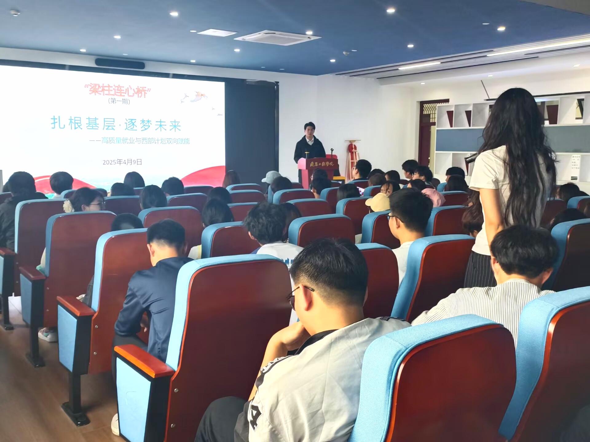 宣讲会上,周莉莉解读了2025年就业形势与西部计划的政策,并就前期收集的17条学生关心关切的问题,现场进行了逐一解答。随后,播放了西部计划志愿者纪实纪录片《到西部去》,片中志愿者扎根边疆、服务群众的真实故事引发热烈反响。