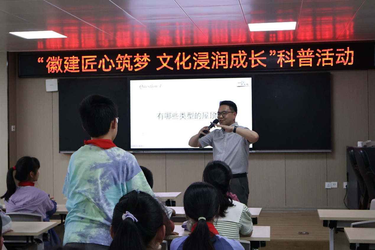 活动伊始,程飞博士受聘为黄山市屯溪长干小学科学副校长,协助推进小学科学课程教学,建立校地联动机制,共同探索科技创新人才培养模式。聘任仪式后,程飞博士以“有趣的屋顶”为主题,为小学生们带来了一场建筑营造科普讲座。从屋顶形制到建筑文化,通过生动的案例和互动方式将专业知识转化为童趣语言,向孩子们科普建筑知识,引发孩子们的观察与思考。并组织宣讲团融入孩子们当中,指导绘制屋顶结构图,搭建三维建筑模型,激发孩子们的动手热情。活动融知识性与趣味性于一体,不仅拓展了孩子们的科学视野,也培养了动手能力和创新意识。