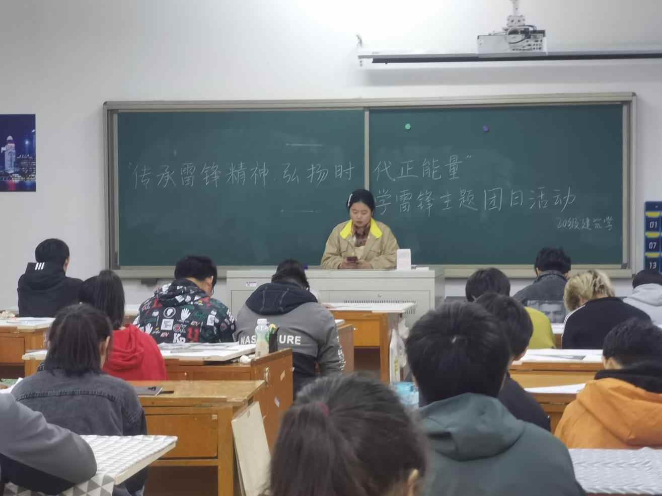 2021年3月18日晚,20建筑班在文峰楼6503举行了“传承雷锋精神,弘扬时代正能量”主题班会。班会由辅导员李倩倩主持,学生59人全部参加活动。团支部书记王睿介绍了雷锋日的背景以及雷锋助人为乐的事迹,讲述了雷锋的一生,鼓动全员向雷锋学习,接着同学们也分享了雷锋小故事或者自己的助人为乐的事迹。
