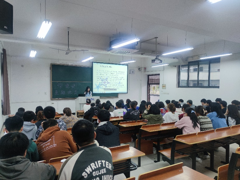 党史的学习主要以PPT形式向大家展现,并由刘苏红同学向大家讲解。学习内容主要有以下四部分学习党史的必要性、党史的时期划分、党在历史上的几次重要会议、党的四代领导集体的形成。通过讲解形式使同学们印象更加深刻,更加有感染力,在班会的进行过程中同学们都保持纪律。