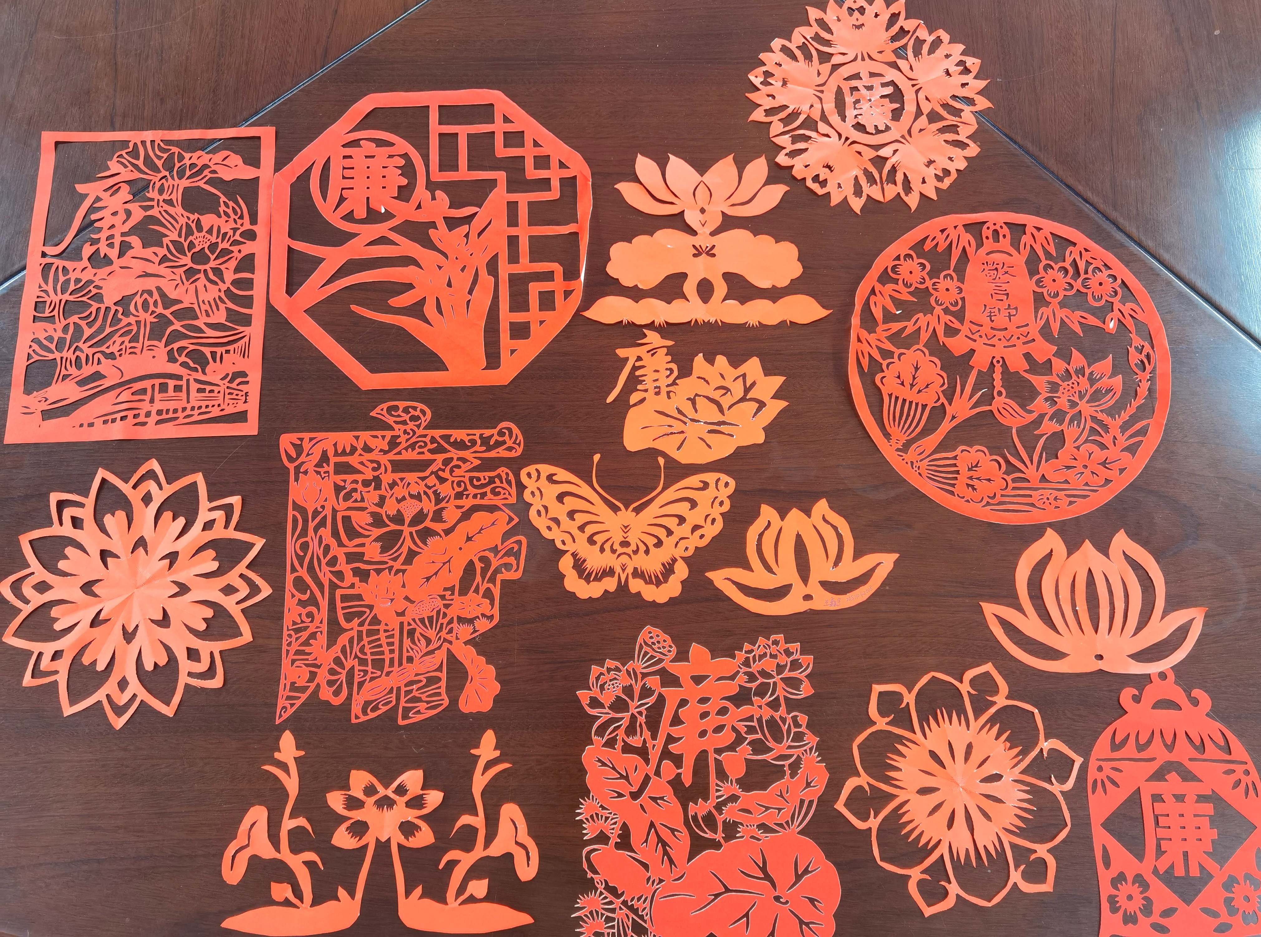 随后,同学们在指导下,手持剪刀和红纸,小心翼翼地勾勒线条、裁剪图案,有的同学剪出了“出淤泥而不染”的荷花,有的同学创作了“节节高升”的竹子,还有的同学将“廉”字与建筑元素巧妙结合,或融入陶行知“捧着一颗心来,不带半根草去”的名言,让教育家精神与廉洁理念相融。
