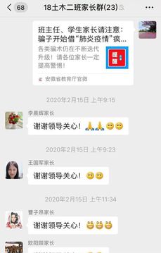 学院结合实际,迅速进入“战时”状态,积极落实学校整体部署,通过多种渠道充分了解疫情发展情况,做好疫情防控工作处理预案。第一,密切联系学生,及时掌握学生动态。构建辅导员—年级—班级—家长四级信息反馈机制,通过“钉钉”健康打卡行动,做到日查、日报、日反馈制度,实时把握每一名学生当天基本情况。第二,全方位采取措施,多途径加强防控。引导学生做好网络学习准备,提高“互联网+教育”下的学习适应力,有序参与网上教学辅导,督促学生按时完成学习任务,及时传达学校防控安排,讲解防控知识,提醒学生做好日常防护。第三,辅导员通过召开线上主题班会及时远程心理疏导,排解疫情防控期间不良情绪,克服学生恐慌忧虑心理。第四,及时掌握舆情动态,提高学生防骗意识。利用“两微一端”积极向家长和学生宣传特殊时期防诈骗知识,科学甄别网络信息,提高警惕,以防上当受骗。第五,利用网络新媒体平台,扎实做好学生育人工作。积极引导学生通过青年大学习、学习强国、易班等开展主题教育活动,引导广大学生厚植爱国情怀,将情感的力量转化为奋进的力量,树立正确的历史观、民族观、国家观、文化观。