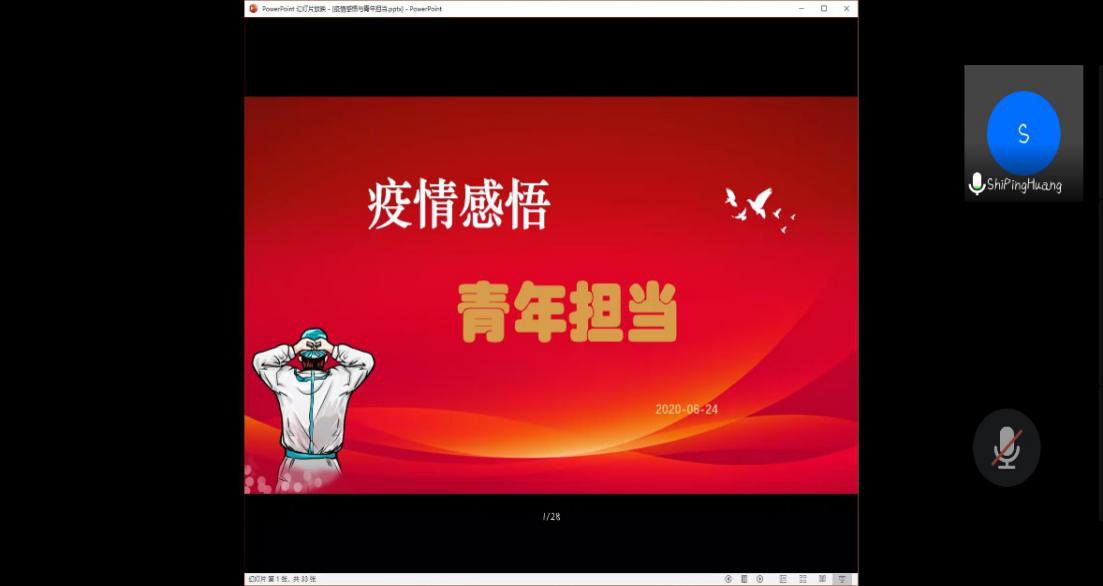 学院党委副书记黄世平,通过一个短片由点及面讲述了抗击疫情的十六字方针及疫情带来的启示——爱国、敬业、使命、责任和担当。关键时刻,疫情就是命令,防控就是责任。他强调,新时代中国青年要担当精神和责任意识。希望同学们通过疫情学会敢做为的担当精神,勇担重担,用行动践行责任与使命。