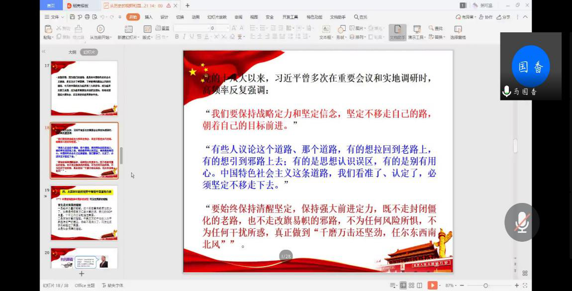 马国香从“什么是中国特色社会主义道路”开始,通过中央文件及领导人对道路自信的表述,让同学们对道路自信有基本了解。通过讲解中西双方的形式、优点,并列举多例中国在历史上的成就,体现了中国道路上的的正确选择。指引同学们要坚持理想信念,善于学习和勇于创新。