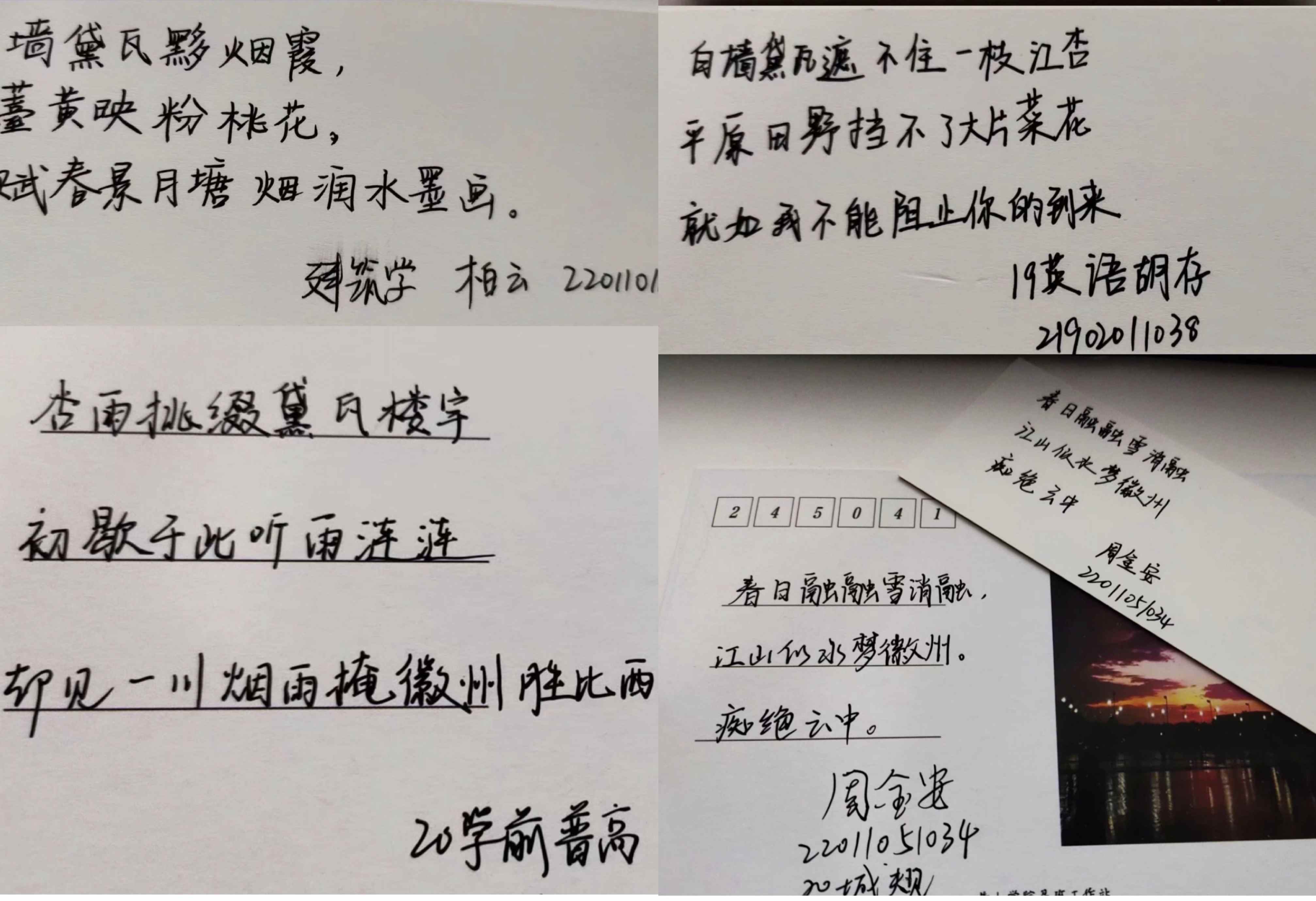 三月万物复苏,此时的徽州就像一幅古老的水墨画,或浓或淡地书写着徽州的柔情。同学们根据自己与春天和徽州的接触通过诗句表现出来,不仅能展现诗文化与诗歌魅力,陶冶同学们的情操,展示出自己对诗歌的热爱;更是丰富了同学们的课余生活,提高了同学们的文学素养。