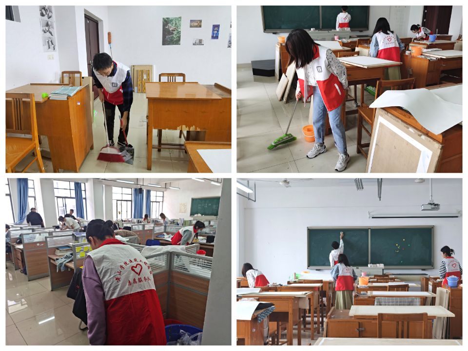 此次活动共分15个志愿小组,对学院的专业教室进行卫生清扫。活动中,志愿者们纷纷拿起扫帚、簸箕等工具,捡拾、清理课桌垃圾、扫除黑板粉尘,经过两多小时的分工协作,教室环境焕然一新。