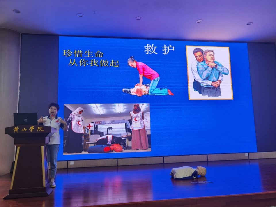 随后,黄山市红十字会常务副会长李瑜娟从中国红十字的历史由来展开,讲述了应急救护和捐献造血干细胞的知识,同时现场演示教学心脏复苏以及“海式法”解除气道梗阻的手法,并详细讲述了注意事项。活动最后来自19城乡规划的献血志愿者薛祖成同学分享了自己的献血事迹和献血感悟,鼓励同学们积极参与到无偿献血这个大家庭中来。