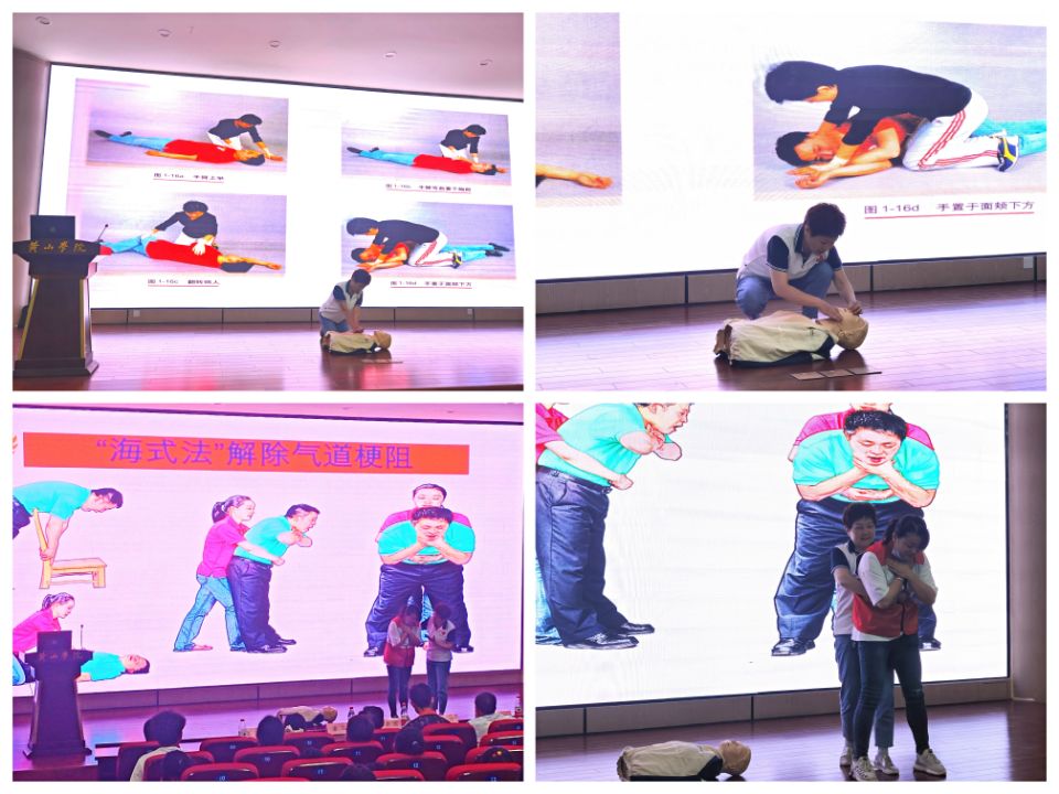 随后,黄山市红十字会常务副会长李瑜娟从中国红十字的历史由来展开,讲述了应急救护和捐献造血干细胞的知识,同时现场演示教学心脏复苏以及“海式法”解除气道梗阻的手法,并详细讲述了注意事项。活动最后来自19城乡规划的献血志愿者薛祖成同学分享了自己的献血事迹和献血感悟,鼓励同学们积极参与到无偿献血这个大家庭中来。