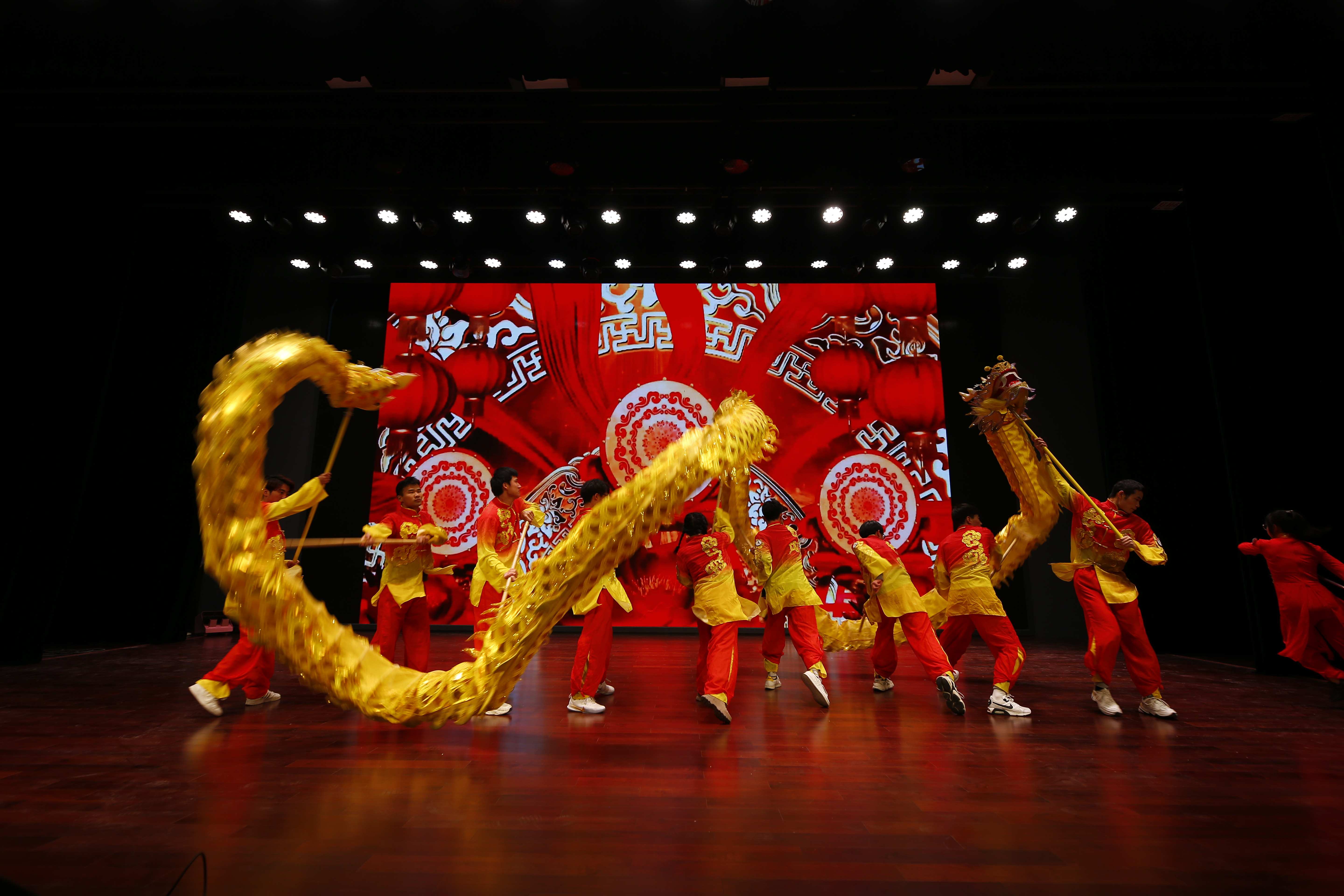 晚会伊始,一则暖场视频带领大家领略了学院风采。随后在气势磅礴的音乐中,舞龙队队员们活力四射的表演,为晚会营造了热烈的氛围。