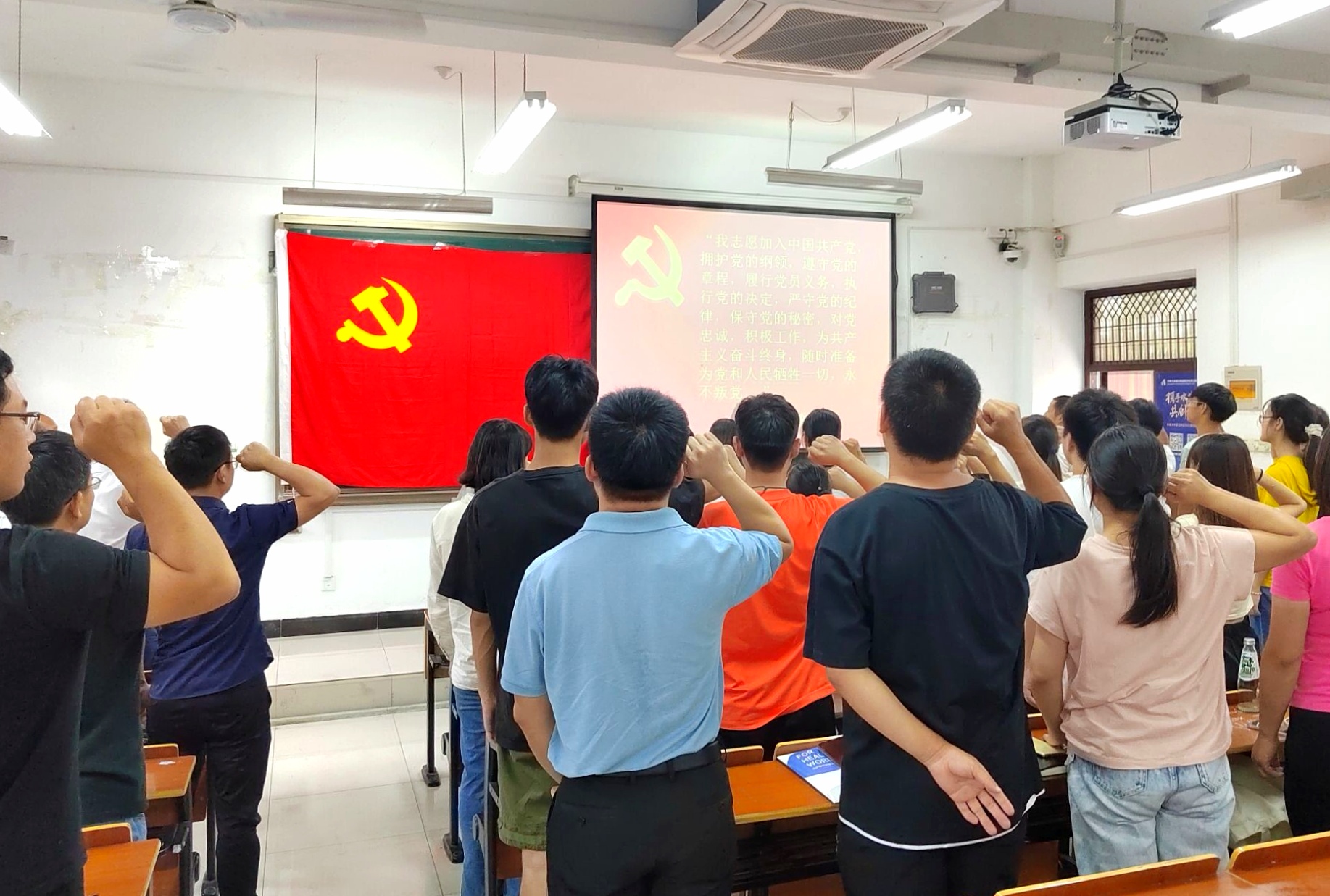 鲜红的党旗,醒目的主题,简洁有力地为现场渲染出庄严肃穆的气氛,宣誓仪式在合唱《国际歌》中拉开帷幕。程鹏宣读了中共太阳集团网站8722委员会《关于同意吸收刘娇娇等21名同志为中国共产党预备党员的批复》文件,黄世平书记为预备党员佩戴了党徽,许政带领21位预备党员进行了宣誓。
