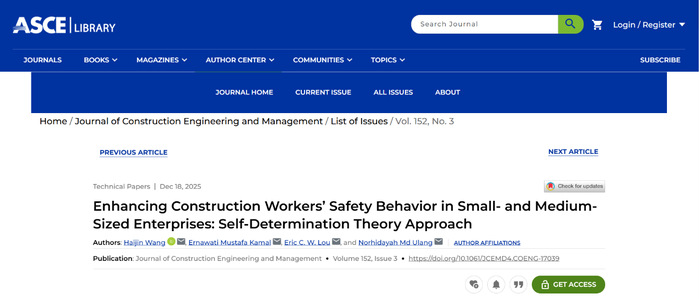 我校太阳集团网站8722教师汪海津博士与马来西亚理科大学、英国曼彻斯特城市大学学者合作的最新研究成果“Enhancing Construction Workers’ Safety Behavior in Small- and Medium-Sized Enterprises: Self-Determination Theory Approach”在工程管理领域权威期刊Journal of Construction Engineering and Management上发表。该期刊隶属美国土木工程师学会(American Society of Civil Engineers,ASCE),为中科院二区期刊(五年期IF=5.6)。tyc8722太阳集团为本文的第一署名单位。
