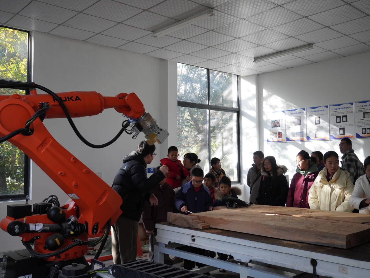 活动伊始,参与家庭分为两组,在建筑学党支部志愿者的专业引导下开启平行参观,展开多层次、全方位的文化探索。一组步入一楼展厅,中国建筑史模型成果展;模型构建区的激光切割与雕刻机现场演示引得大家驻足围观,志愿者细致详解现代科技对传统建筑模型制作的赋能与助力,让亲子家庭直观感受科技与传统的碰撞融合。另一组在二楼徽派建筑模型展厅溯源文化根脉,村落园林、祠堂民居、雕刻构件三大展区系统呈现徽派建筑的营造技艺与深厚文化内涵。志愿者在三雕模型前,结合社区周边传统建筑实例,生动解读其兼具实用价值与美学追求的设计理念;紧邻的学生设计课程作业展区,则直观展现了学子们的创新设计思考力,为亲子家庭带来别样启发。