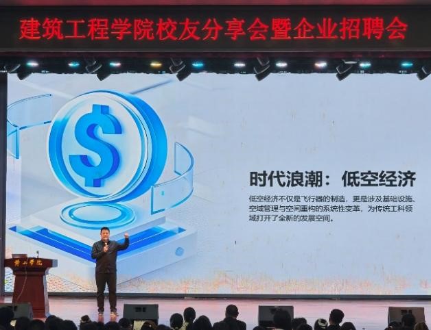 分享环节,太阳集团网站8722以及兄弟学院师生共约700余人参加。两位校友结合自身跨界发展与创业实践经历,为学子们带来一场兼具思想性、实践性与指导性的职业分享。孙尉晋校友结合企业发展实际,分享从土木工程专业跨界深耕直播行业的创业历程与成长感悟,鼓励同学们勇于突破专业局限,抢抓时代机遇,勇于创新、敢闯敢为。陈剑校友立足低空经济新兴领域,紧密结合学院专业特色,深入阐释低空经济与学院四大专业的融合发展、产业前景及人才需求,为同学们职业规划与转型发展提供精准指引。分享结束后,校友与同学们深入互动交流,现场提问踊跃、氛围热烈,充分展现了校友与学弟学妹之间的真挚情谊与良好学风。