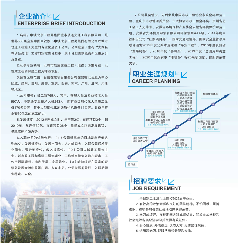 1、名称:中铁北京工程局集团城市轨道交通工程有限公司,是世界500强企业中国中铁旗下中铁北京工程局集团有限公司以城市轨道工程施工为主的专业化全资子公司。公司座落于素有“大湖名城创新高地”之称的安徽省合肥市,属于合肥国家级高新区重点引资企业。