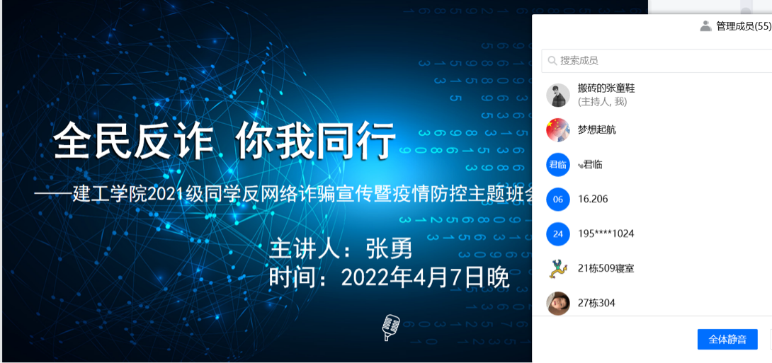 为加强学生安全教育,提升学生日常生活中安全防范意识,预防和切实减少校园电信网络诈骗案件发生,保护在校学生的财产安全,同时针对当前疫情严峻形势,进一步提升在校学生对于当前黄山市疫情紧张形式认识和学校防疫政策理解,建筑工程学院2021级于2022年4月7日晚开展了反网络诈骗宣传暨疫情防控线上主题班会活动,本次班会由张勇老师主持宣讲。