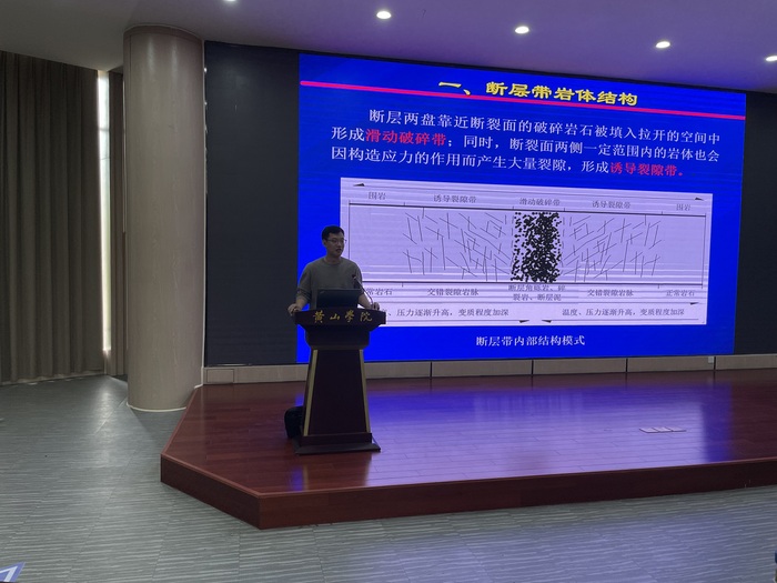 报告以断层带岩体活化突水问题展开,分别从理论分析、现场调查、室内试验和数值模拟等角度,介绍了断层诱导裂隙带岩体和滑动破碎带土石混合体的断裂破坏机制及渗流演化规律。报告指出,研究渗压作用下断层带岩体的断裂导渗演化机制,对于深入揭示断层带突水机理和前兆规律,实现矿井突水灾害的超前预测预警都具有十分重要的理论与工程意义。整场报告集科学性、知识性、趣味性于一体,深入浅出,内容丰富,激发了在场师生的研究兴趣。