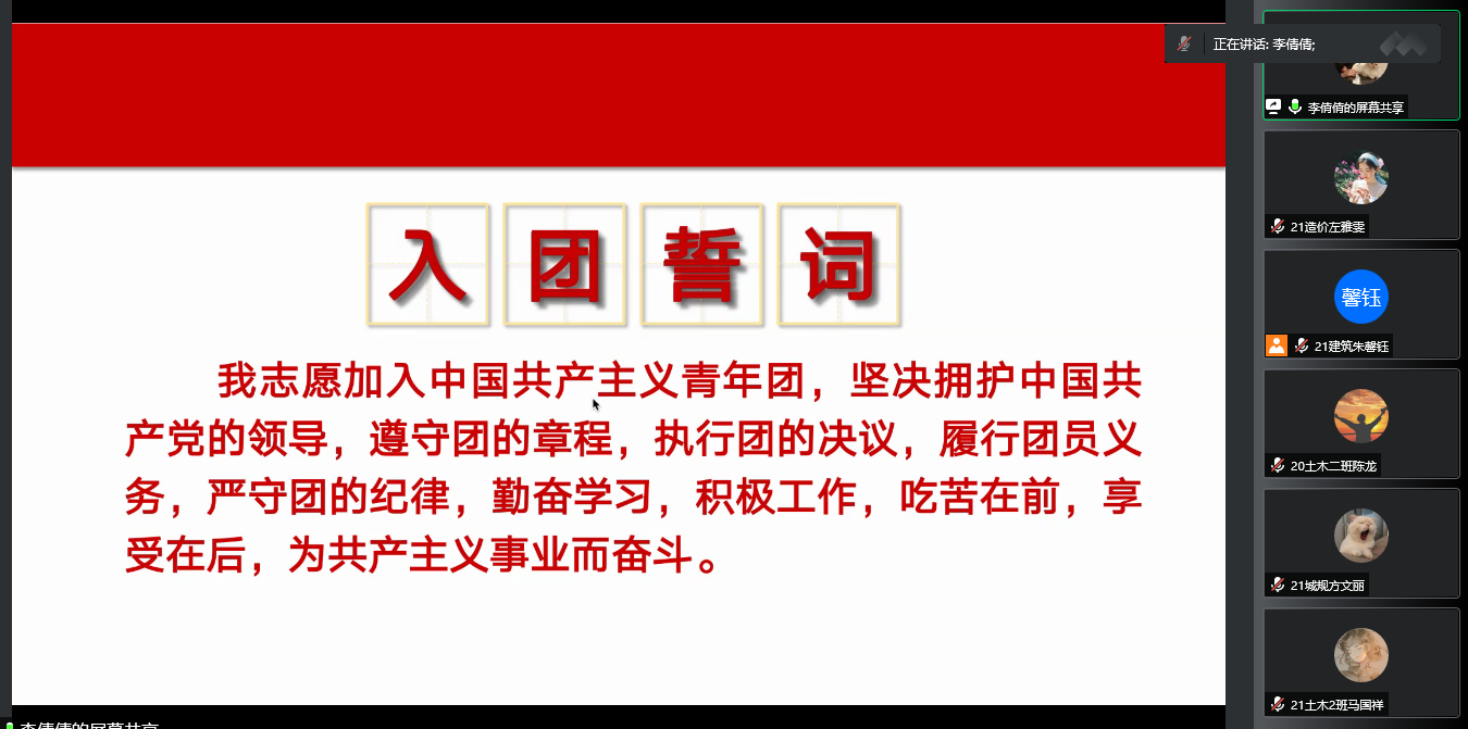 李倩倩带领大家学习了《中国共产主义青年团章程》,并结合主题从团的性质、团的历史、团的建设、党的领导等方面对团章进行了详细讲解,让同学们了解到中国共青团是中国共产党的后备军。同时,鼓励同学们要常怀感恩之心、长存忧患之心、永葆革命精神、永葆进取之志。