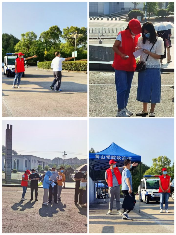 在学校门口,志愿者们帮助工作人员核查考试人员的核酸报告及检测体温,严格落实疫情防控要求。进入校门后,志愿者们在通向文澜楼的各个路口为考试人员指引,确保考生们快捷准确的找到考场位置。
