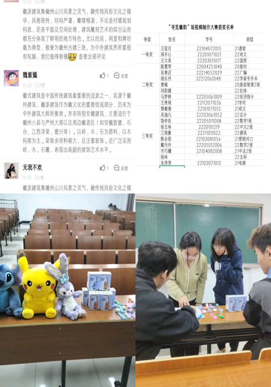 比赛一经发布,全校同学踊跃报名,积极参与。参赛者需自制原创徽建视频发布至易班课群进行参赛评比,在上传视频的同时,可在易班“寻梦徽韵”轻应用中参与评论,发表自己对于徽派建筑的见解。经过层层筛选,最终选出一等奖三名,二等奖七名,三等奖十名,并颁发相应奖品。