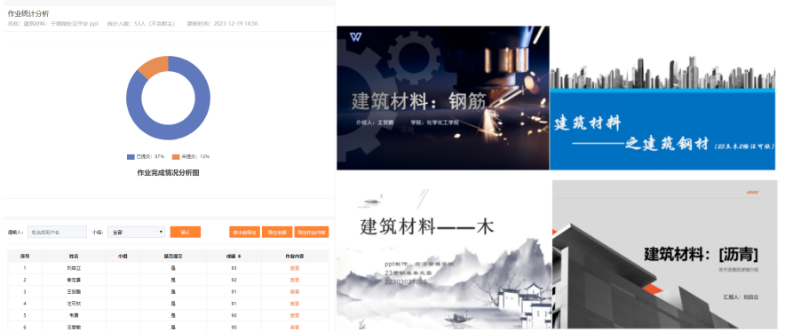 针对建筑材料的质量和性能对建筑的安全性、经济性和美观性等方面的重要影响,本次活动组织学生制作ppt来介绍建筑材料,阐述不同材料在建筑工程中作用以及对建筑安全的影响。学生在规定时间内上传制作的ppt至指定课群,易班工作站组织人员进行评分。