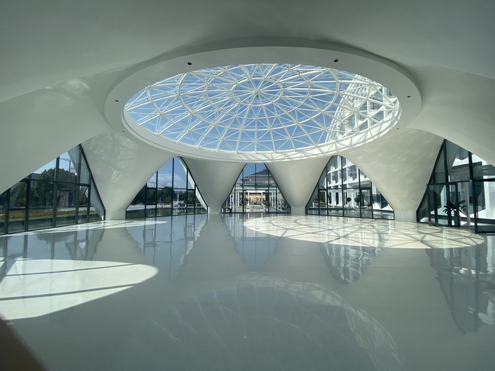 黄山水文化体验中心位于黄山市徽州区经济开发区,建筑面积7407平方米,地上五层,一层为水文化展示厅,二至五层为矿泉水疗养会所,地下室为矿泉水新品发布会场。无极雪矿泉水引自黄山山麓蜀源村深岩隙水,村中有数孔历史悠久古井,井水含丰富养生矿物质,村庄周边有千亩郁郁葱葱的向日葵田。主楼的屋顶设计成水流的轮廓,附楼混凝土薄壳呈向日葵形态,与徽州井亭遥相呼应。