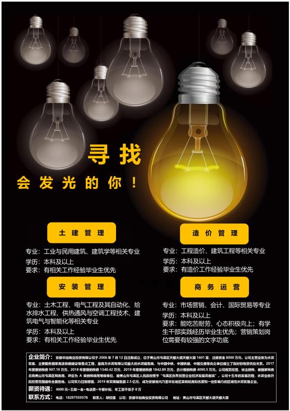(一)工程造价专业人才二名:本科学历,思想品德好,吃苦耐劳,勤于学习,有团队精神,公司支持业务培训。