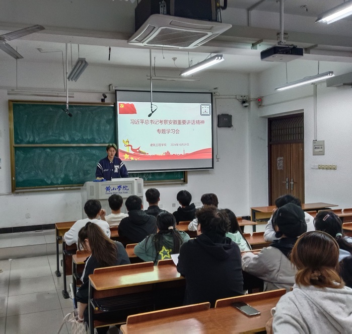 在院党委的周密部署和悉心指导下,本次学习活动采取了“集中学习与交流研讨相结合”的方式。会上,全体学员首先深入学习了习近平总书记三次考察安徽时发表的重要讲话精神。建筑学专业的刘建翔同学、工程造价专业的魏淑婷同学以及城乡规划专业的陶宇璟同学,分别带领大家学习了2016年、2020年和2024年习近平总书记考察安徽时的重要讲话核心要义。土木专业的王梦凡同学则领学了安徽省省委书记梁言顺在全省领导干部学习贯彻习近平总书记考察安徽重要讲话精神大会上的重要发言。通过此次学习,全体学员对习近平总书记考察安徽的重要讲话精神有了更为深刻的理解和把握,进一步激发了大家奋发有为、锐意进取的斗志,为今后的工作和学习奠定了坚实的思想基础。