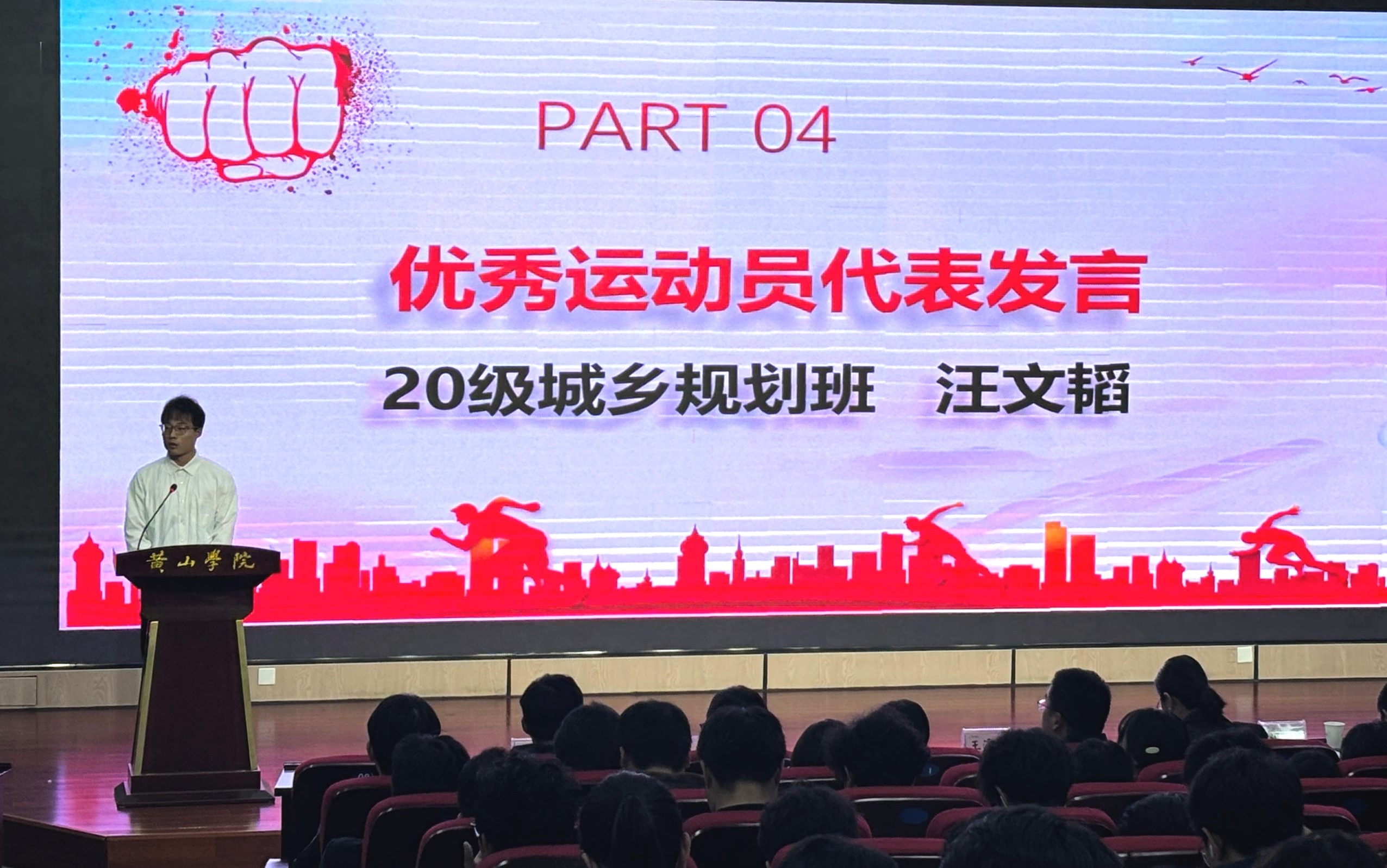 优秀运动员代表,来自2020级城乡规划班的汪文韬同学,以及运动会先进班级代表,来自2024级建筑学班的任芯蕊同学,分别上台发言。他们分享了自己的经验和感悟,激励着在场的每一位同学继续努力,追求卓越。