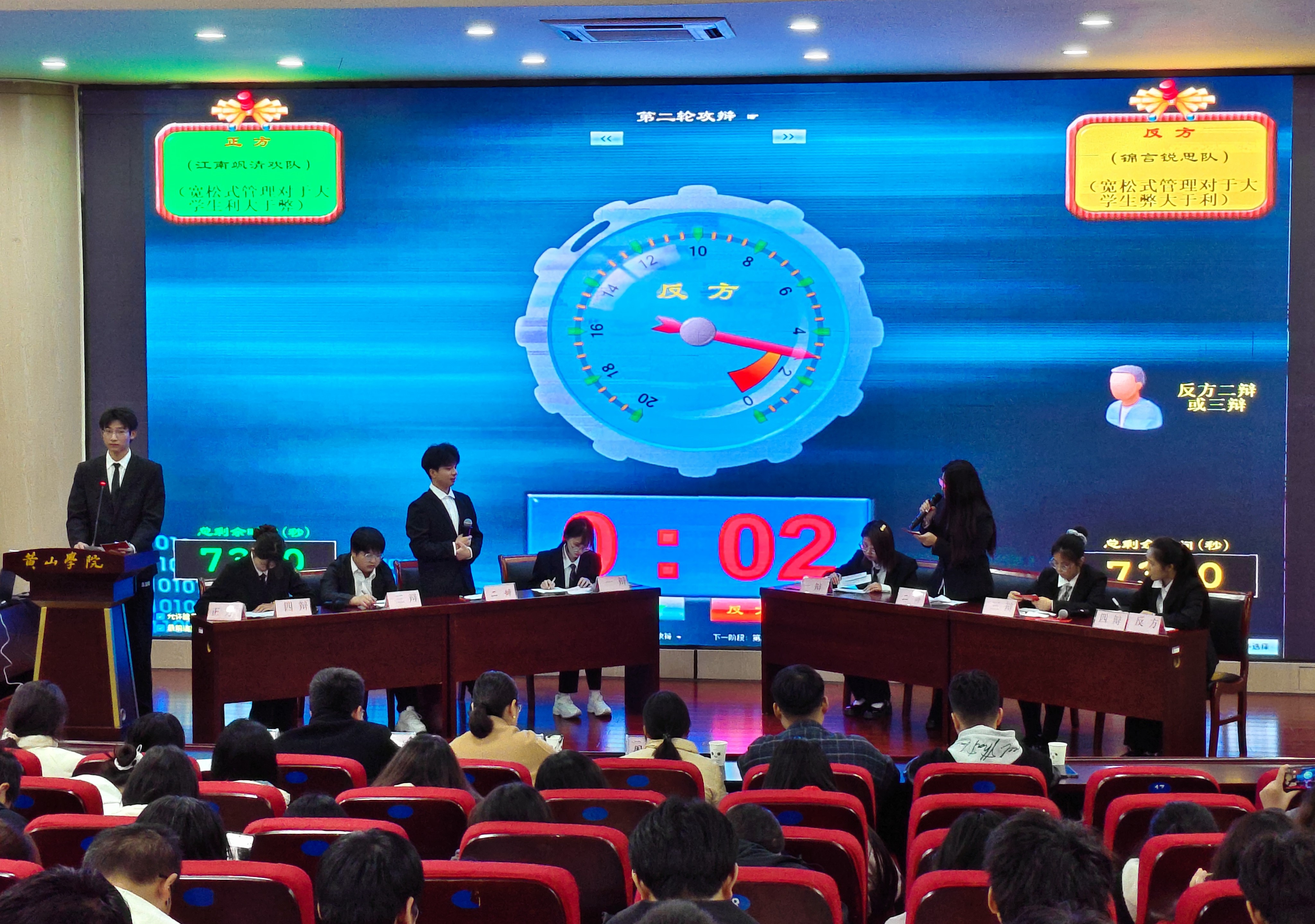 此次比赛历时3周,共有12支队伍参加比赛。经过初赛和复赛的选拔,最终有4支队伍晋级决赛。决赛分两组,4支队伍围绕“人生路上,拿起更难还是放下更难”以及“宽松式管理对大学生是利大于弊还是弊大于利”这两个辩题展开辩论。比赛过程中,双方辩手在立论、攻辩各个环节中思路清晰,引经据典,辩论场面精彩激烈,观众席上的观众也被辩手们的精彩表现所吸引,随着台上辩手的思维跳动,沉浸在视听盛宴中。经过激烈的角逐,江南飒清欢队获得本次比赛的一等奖,锦言锐思队获得二等奖,从容应队获得三等奖,建功筑梦队获得优秀奖,荣获“最佳辩手”称号的是建功筑梦队的三辩程智和江南飒清欢队的一辩张欣。
