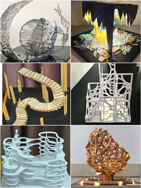 决赛现场,选手们通过PPT演示、实体模型讲解及动态结构模拟,系统呈现作品的设计逻辑与文化内涵。2024级建筑学专业杨嘉慧同学的作品《焦虑》把物理学中微观粒子概念引入设计,通过组合变化,隐喻现代城市空间对人的心理影响,凭借前瞻性思维与精湛工艺摘得桂冠。其余作品亦各具特色。