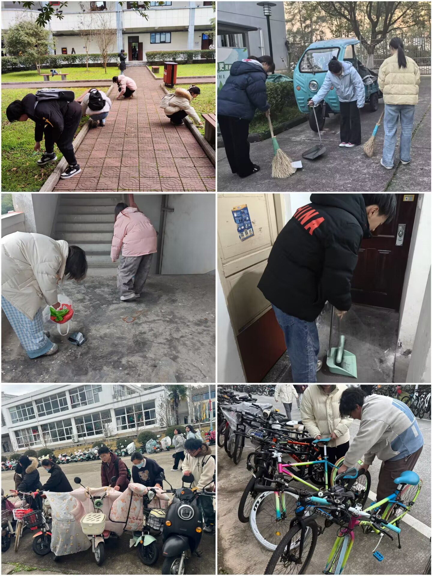 校园微改造,专业显担当。校园内学子们化身“校园规划师”,运用规划技能规范电动车停放区,以“空间优化设计”调整乱停乱放的电动车;在文渊楼中庭,结合园林设计知识清理枯枝落叶,践行绿色建筑理念。